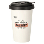 Dolina Noteci Kubek porcelanowy z czarną przykrywką 300 ml Ciężko pracuję na saszety