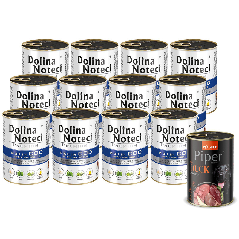 Mokra karma dla psa Dolina Noteci Premium bogata w dorsza z brokułami zestaw 12 x 400 g + Piper Animals z kaczką i gruszką 400 g Gratis