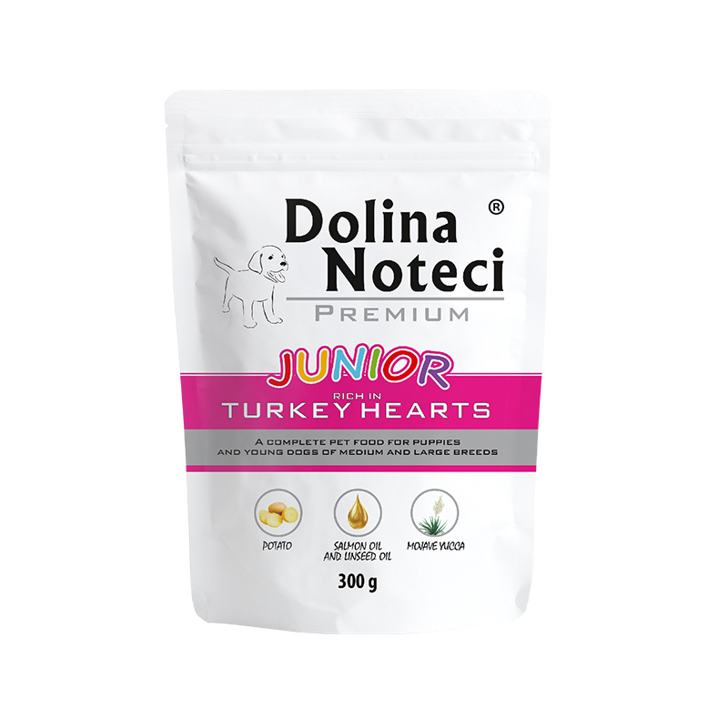 Mokra karma dla psa junior Dolina Noteci Premium bogata w serca z indyka saszetka 300 g