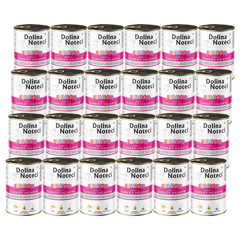 Mokra karma dla psa junior Dolina Noteci Premium bogata w serca z indyka zestaw 24 x 400 g