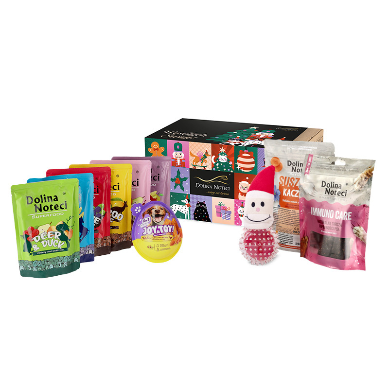 Wyjątkowa świąteczna propozycja dla psów kochających smak i zabawę. W zestawie znajduje się sześć saszetek Dolina Noteci Superfood – receptur pełnych mięsa, takich jak jeleń z kaczką, kangur czy wołowina z sercami gęsi. Każdy posiłek to bogactwo aromatycznych składników i naturalnych wartości odżywczych.