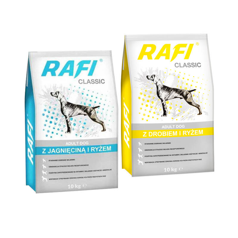 Sucha karma dla psa Rafi Classic z drobiem i ryżem oraz jagnięciną i ryżem mix 2 x 10 kg