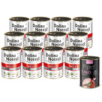 Mokra karma dla psa Dolina Noteci Premium bogata w cielęcinę z zielonym groszkiem zestaw 12 x 400 g + Piper Animals z kaczką i gruszką 400 g Gratis